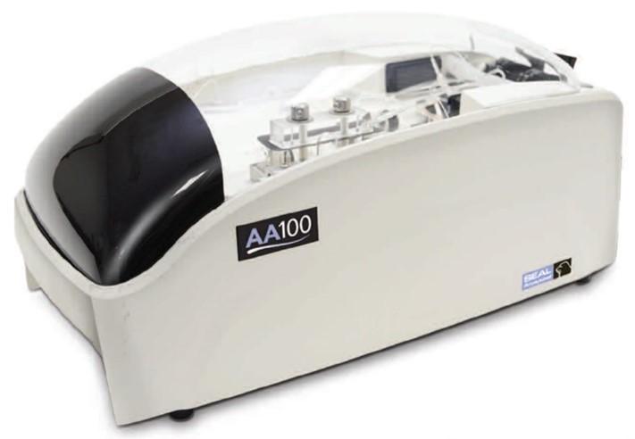 SEAL AA100採用氣泡間隔式流動分析(SFA)之技術原理,樣品及分析試劑透過自動進樣器及高穩定性之蠕動泵帶入化學反應管,運送樣品和試劑途中定期導入氣泡使其產生分段間隔,使樣品和試劑於分段間隔中可達到完全反應之效果。AA100組成主要分為三部分:蠕動泵浦(Pump Module)、化學反應模組(Chemistry Module)及光學偵測器(Photometer Module)。另外再搭配自動進樣器及操作軟體。